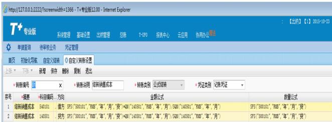 2、在表體中,科目列第一行選擇“主營業(yè)成本“,方向”借方“,第二行選擇“庫存商品“科目,方向”貸方“,輔助項(xiàng)不用選擇,在兩行記錄的金額公式中錄入