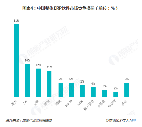 2018年前六大ERP廠商依次為用友網絡、SAP、金蝶國際、浪潮國際、鼎捷和Oracle,國內ERP廠商各家市場份額均有明顯提升,分別為用友網絡31%、金蝶國際12%、浪潮國際11%和鼎捷6%,四家合計達60%。